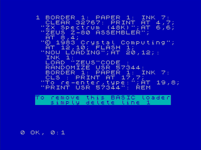 One last quick treat of an emulator screen grab, listing the BASIC loader of the ZEUS assembler…